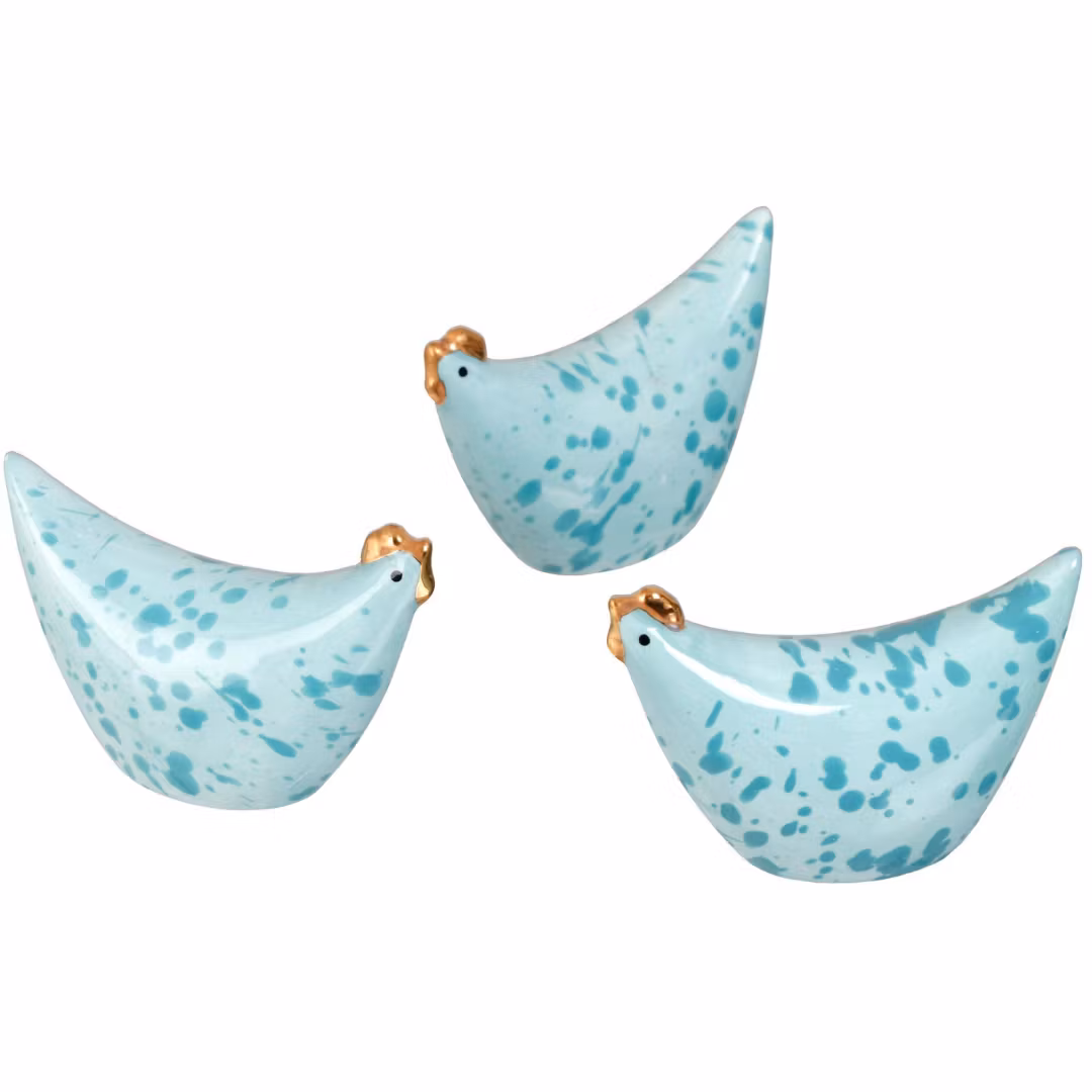 Beskrivning: Påskserien Stänk är inspirerad av hur allmogen på 1700-talet dekorerade väggarna i hemmet. Inför högtider kalkade man väggarna, som blivit sotiga efter allt ved-eldande. Sedan tog man björkris och doppade i blåbärs- och lingonsaft och stänkte prickar på väggarna. Hönorna är målade/stänkta för hand av duktiga hantverkare så varje höna är helt unik.. Med näbb och kam i guld känner de sig påskfina.