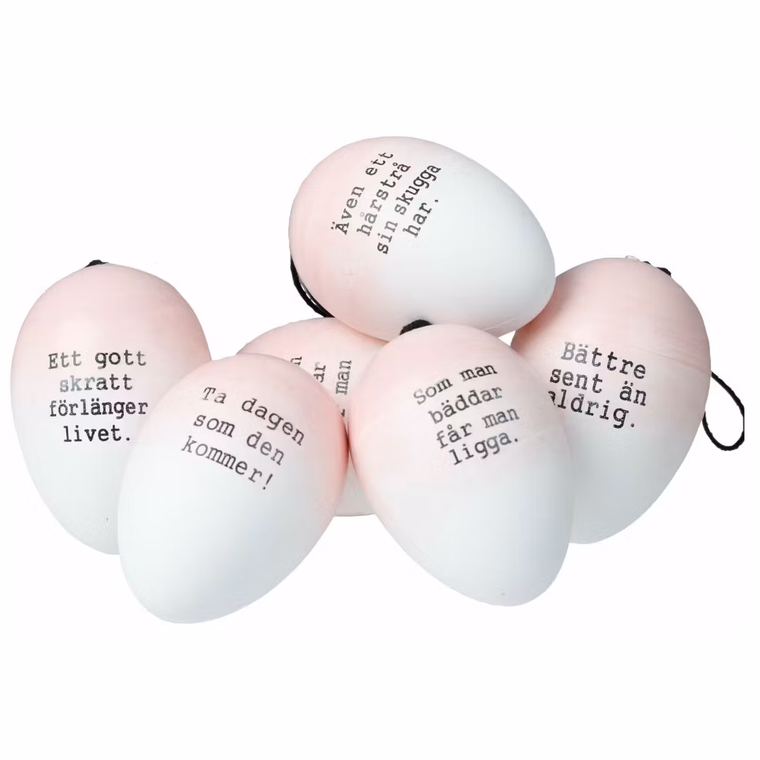 Påskägg/ordspråksägg i 6 pack i rosa och vitt från Cult design att dekorera påskriset med.