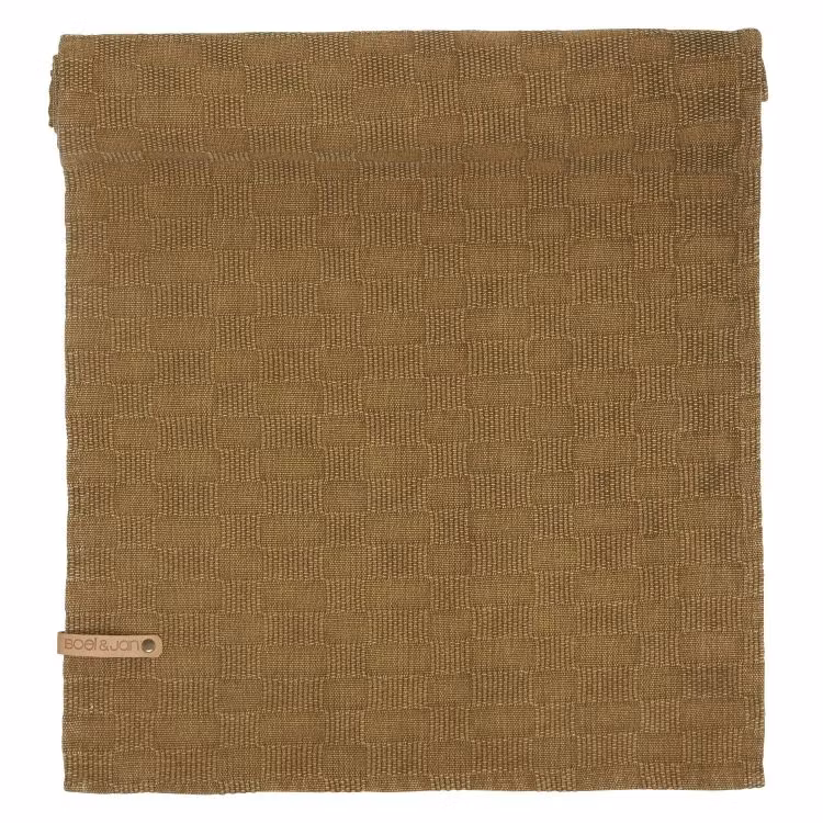 Sense Check en brun löpare med ett dekorativt vävt rutmönster från Boel & Jan, mått 45 x 140 cm.