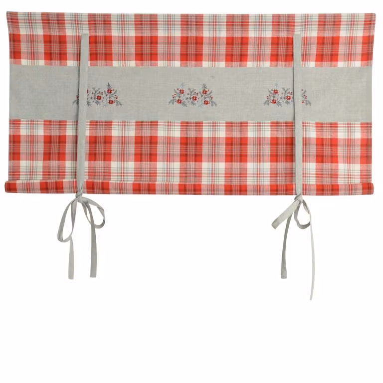 REA! Annika en knythissgardin bredd 140 cm. Färg: Röd och beigerutig med ett broderat blommönster..