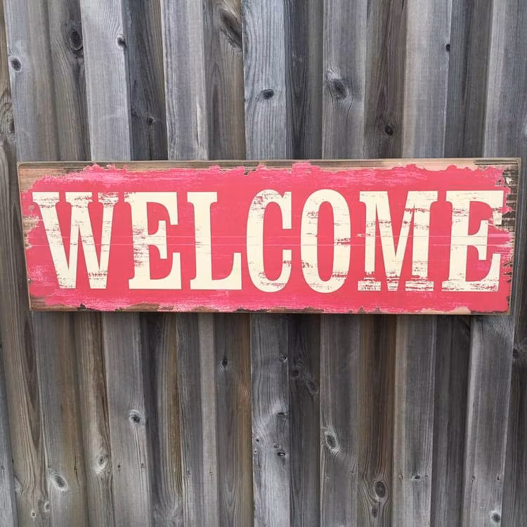 Beskrivning: Welcome är en skönt sliten tavla i goa färger.
