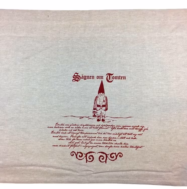 Sägnen om tomten en gardinkappa på metervara, höjd 60 cm. Färg: Linnefärgad med ett rött tomtetryck.