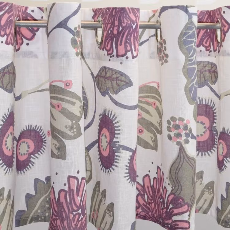 Julia 1 ett gardintyg på metervara från. Färg: Vit botten med ett mönster i rosa och grått.