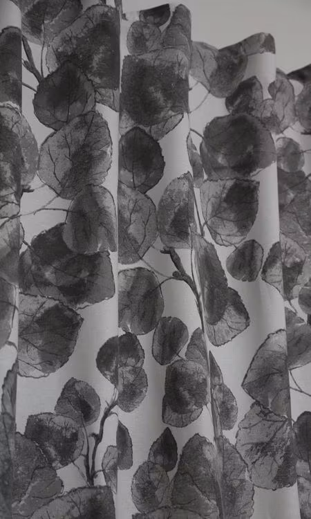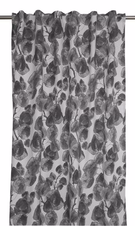 Blader ett gardinset med multiband. Färg: Off-white med blad i grå toner.