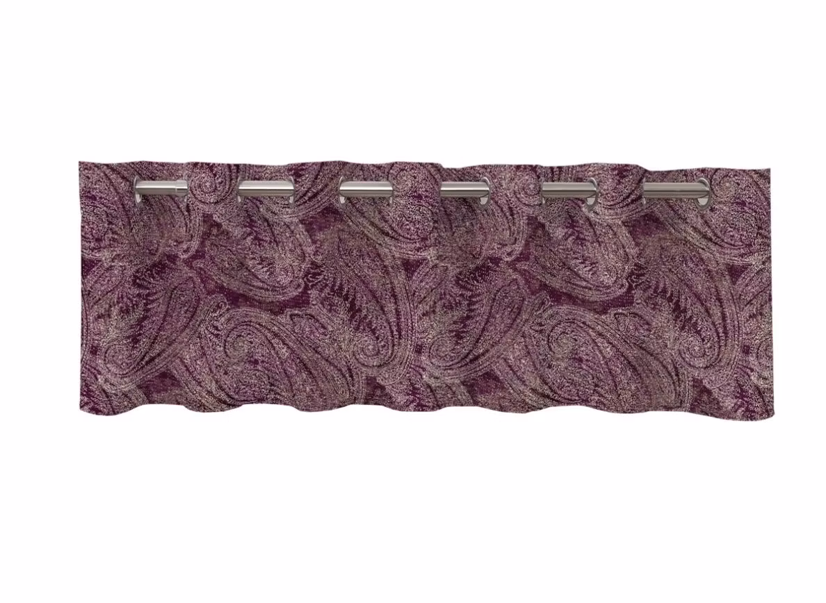 Boss en gardinkappa i en plommonfärgad paisleysmönstrad sammet med öljetter från Redlunds textil.