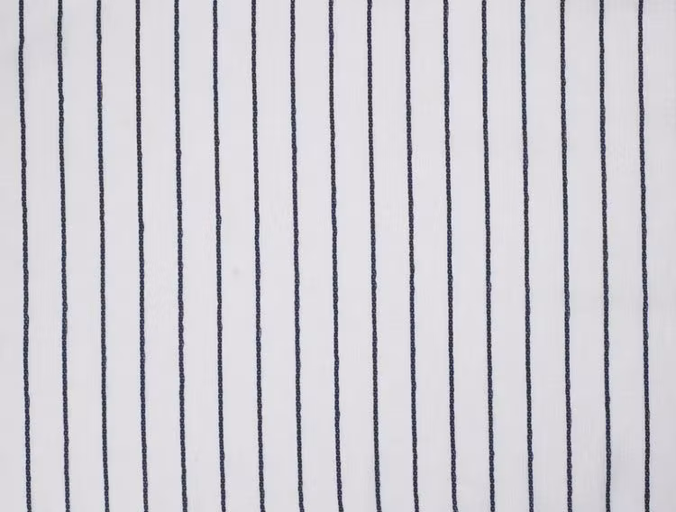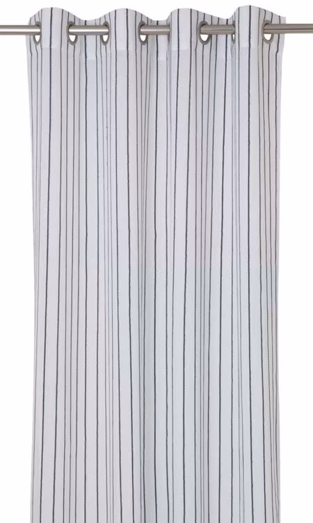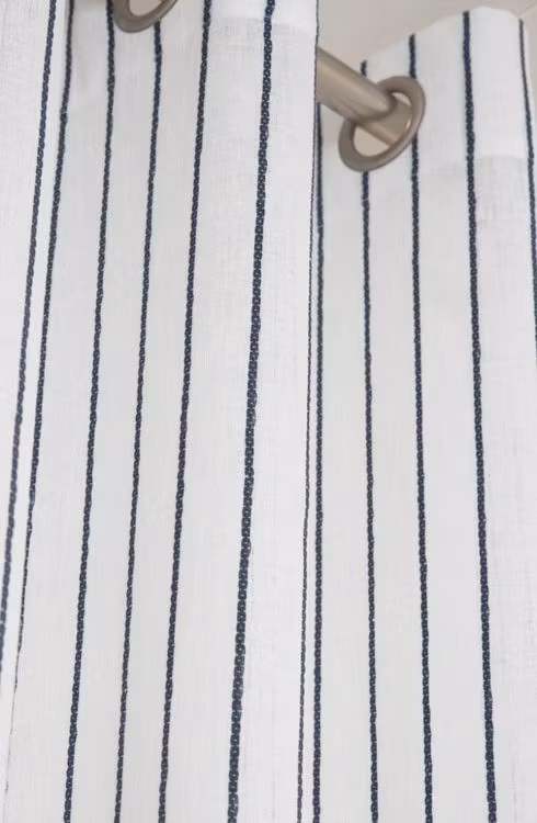 8608 ett gardinset i vitt med en vävd blå rand. Färg: Vit med blåa ränder.