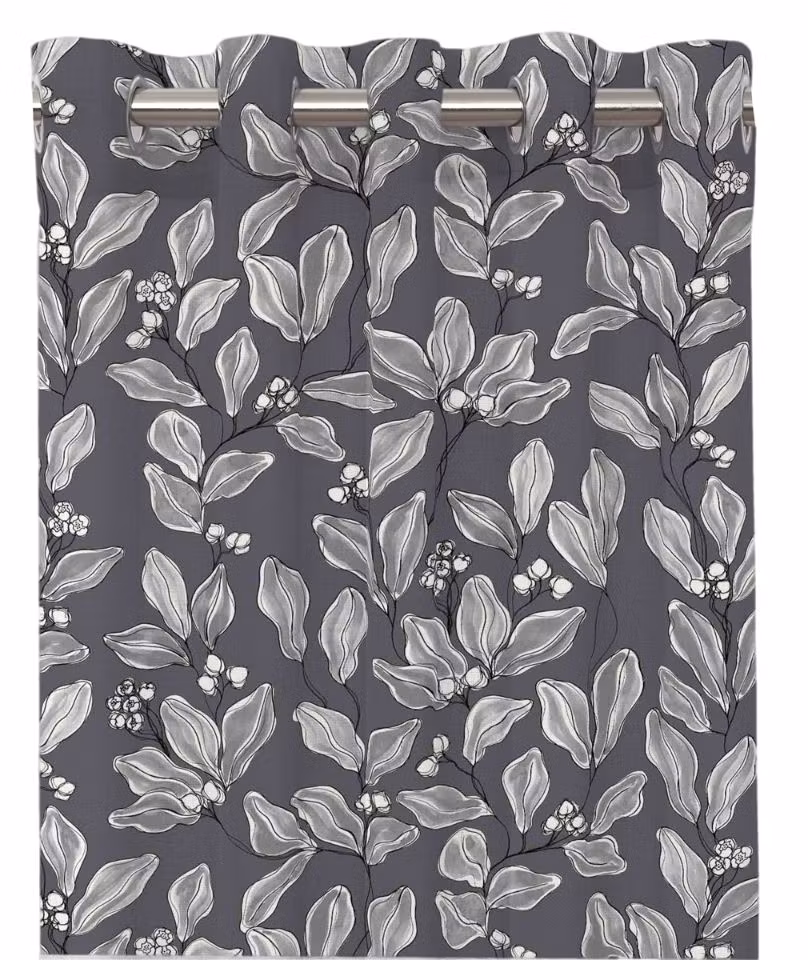 Stella ett färdigsytt gardinset i bomull med öljetter på en grå botten med gråa och vita blad, från Redlunds textil