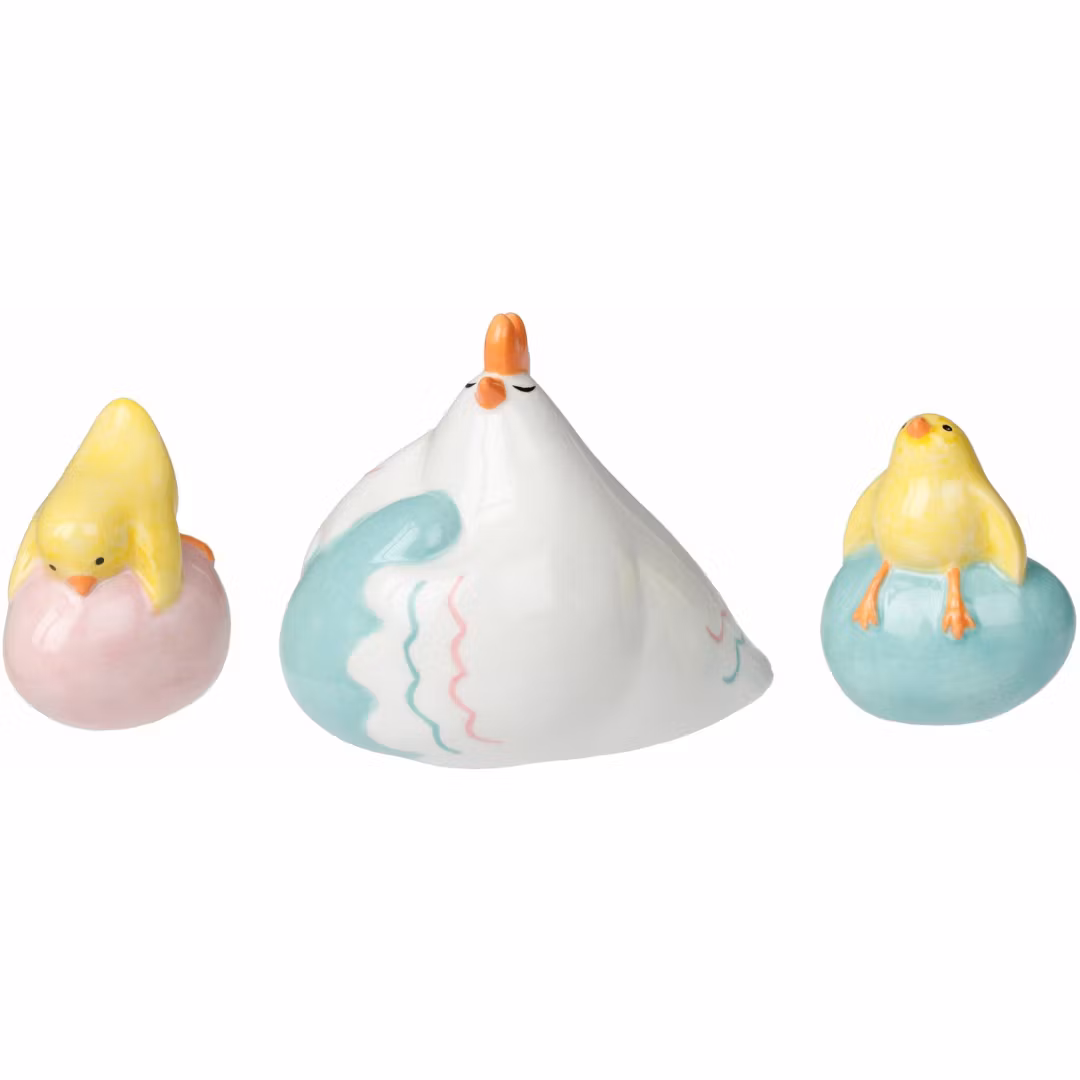 Mini-mini-påsk ett 3 pack med 2 söta gula påskkycklingar med ägg och en påskhöna med ägg i sköna påskfärger.