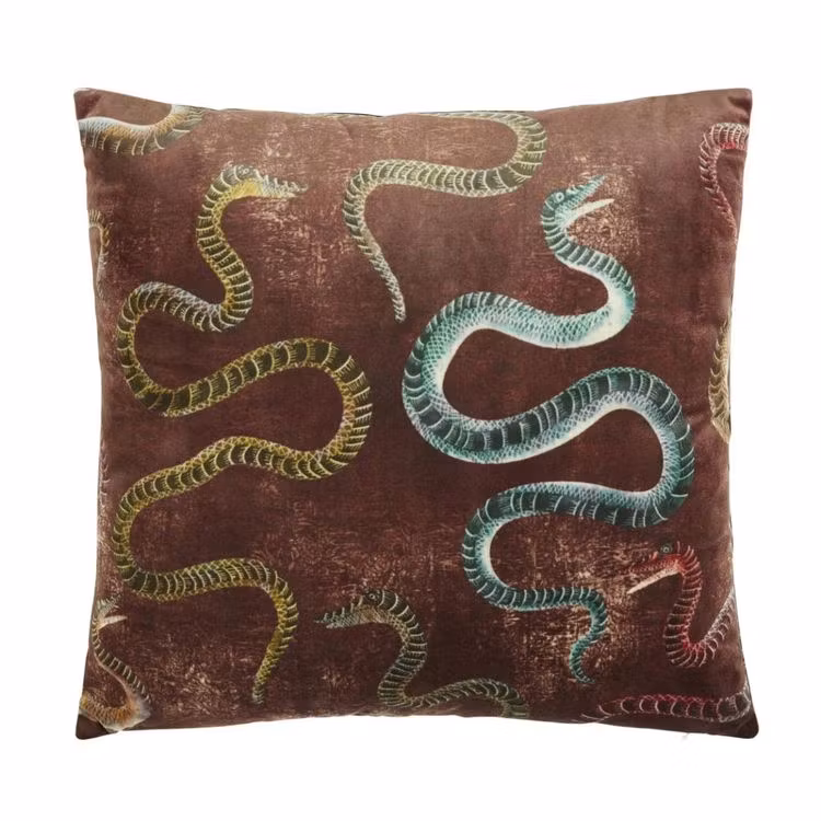 Beskrivning: Kaa är en tuff rödbrunt kuddfodral i sammet med ett ormmönster.