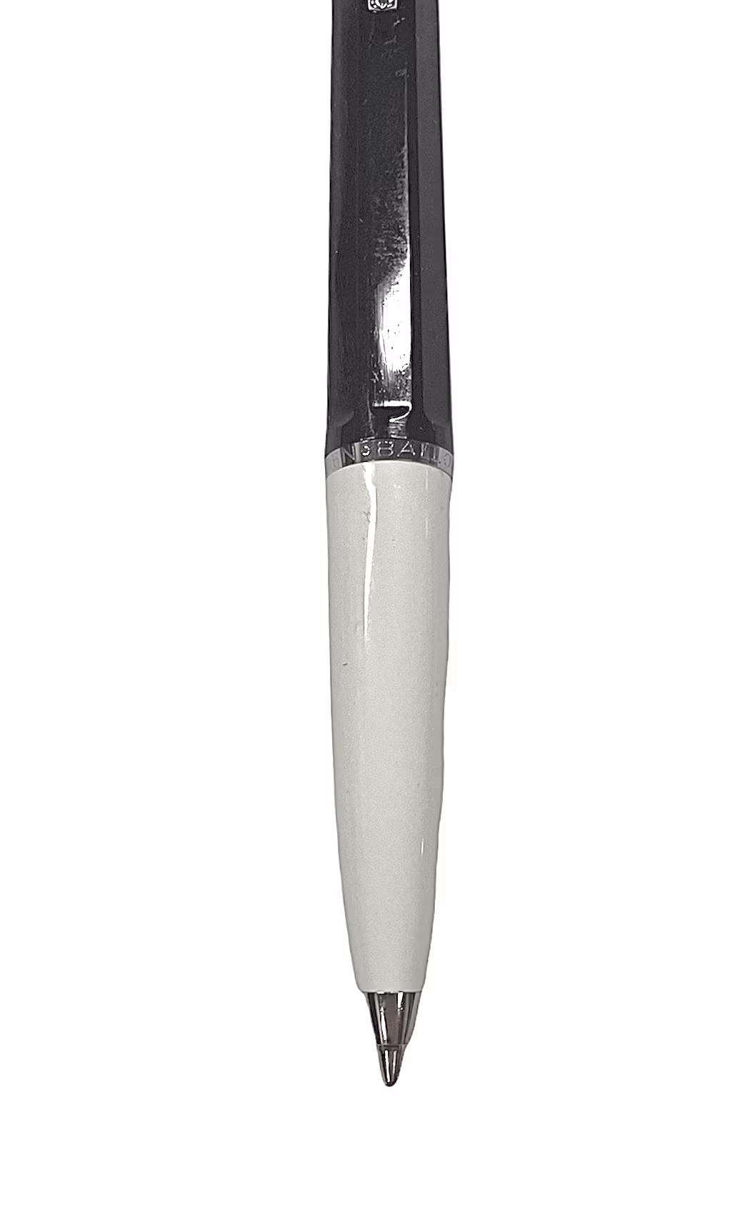 Ballograf Epoca en svart och vit kulspetspenna med silverfärgade detaljer.